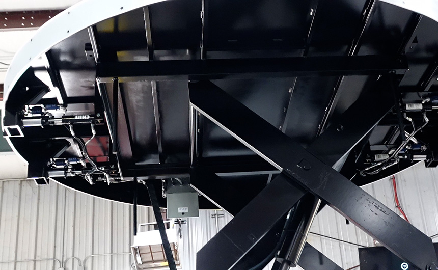 The customer required a solution to bring engines up from a below-grade work area to a comfortable and safe height for servicing. In addition to smooth, vertical travel, the lift system needed to work within the constraints of an existing iris floor mechanism. The iris platform opens/shuts around the engine securing it onto of the lift platform so work can be safely conducted on the jet engine.